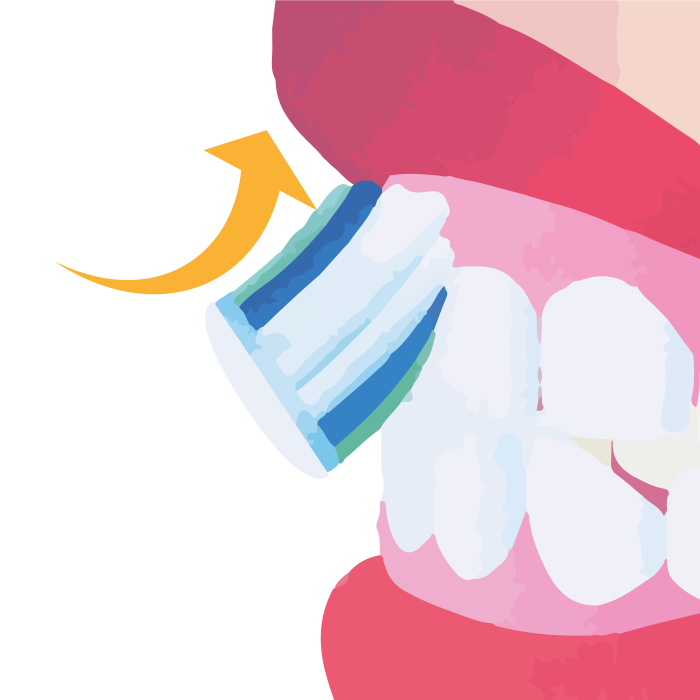 Als letztes werden die Innenflächen mit kleinen Kreisen oder Drehbewegungen „von Rot nach Weiß“, das heißt vom Zahnfleisch zum Zahn gereinigt.